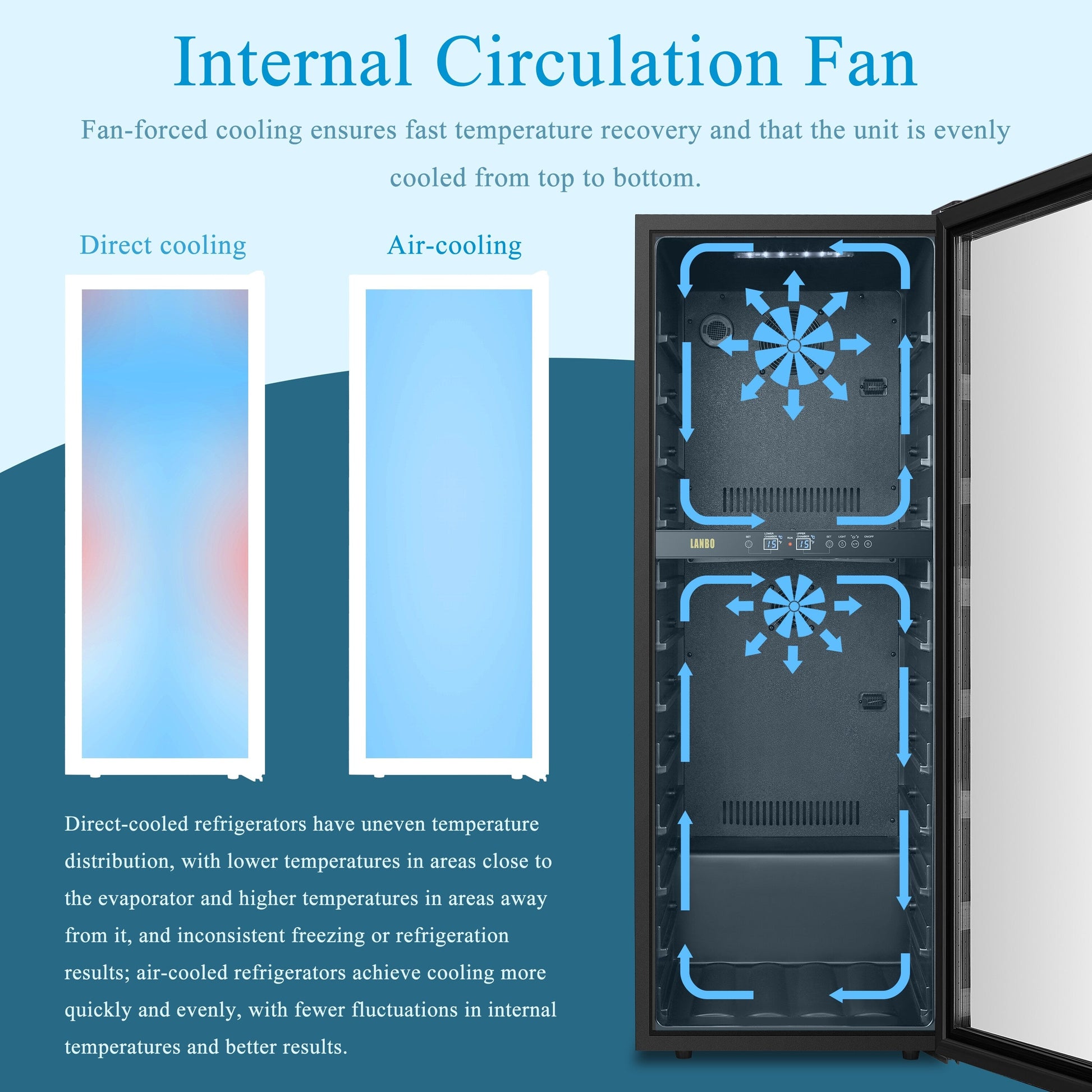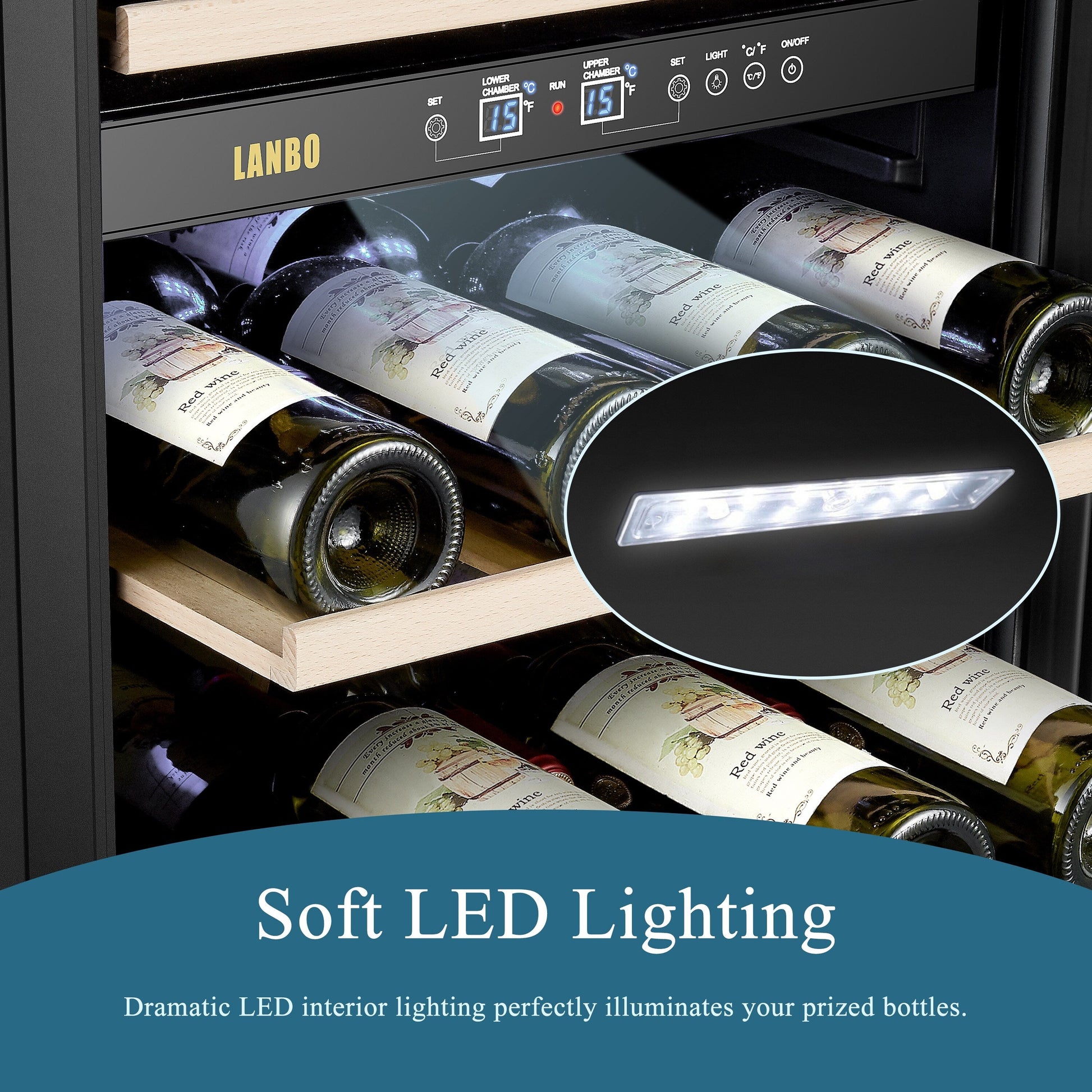 Réfrigérateur à vin autonome Lanbo 20 pouces, 64 bouteilles, double zone, porte vitrée avec garniture en acier inoxydable et deux serrures de sécurité.