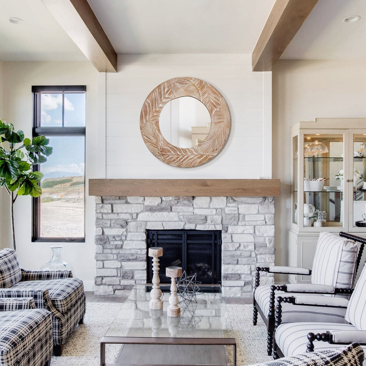 Miroir mural rond en bois sculpté...