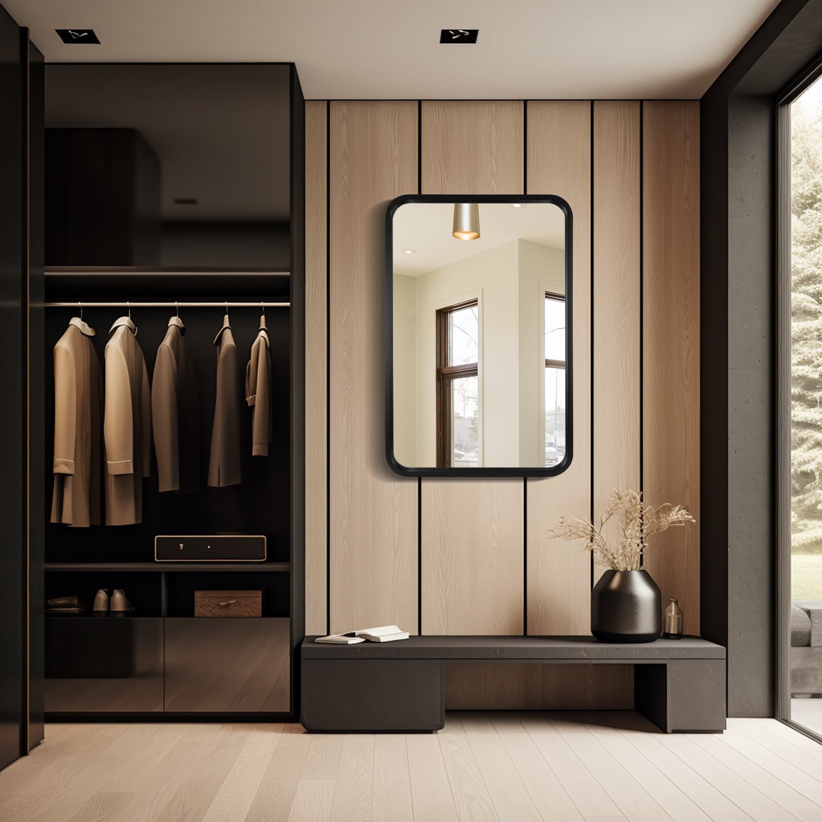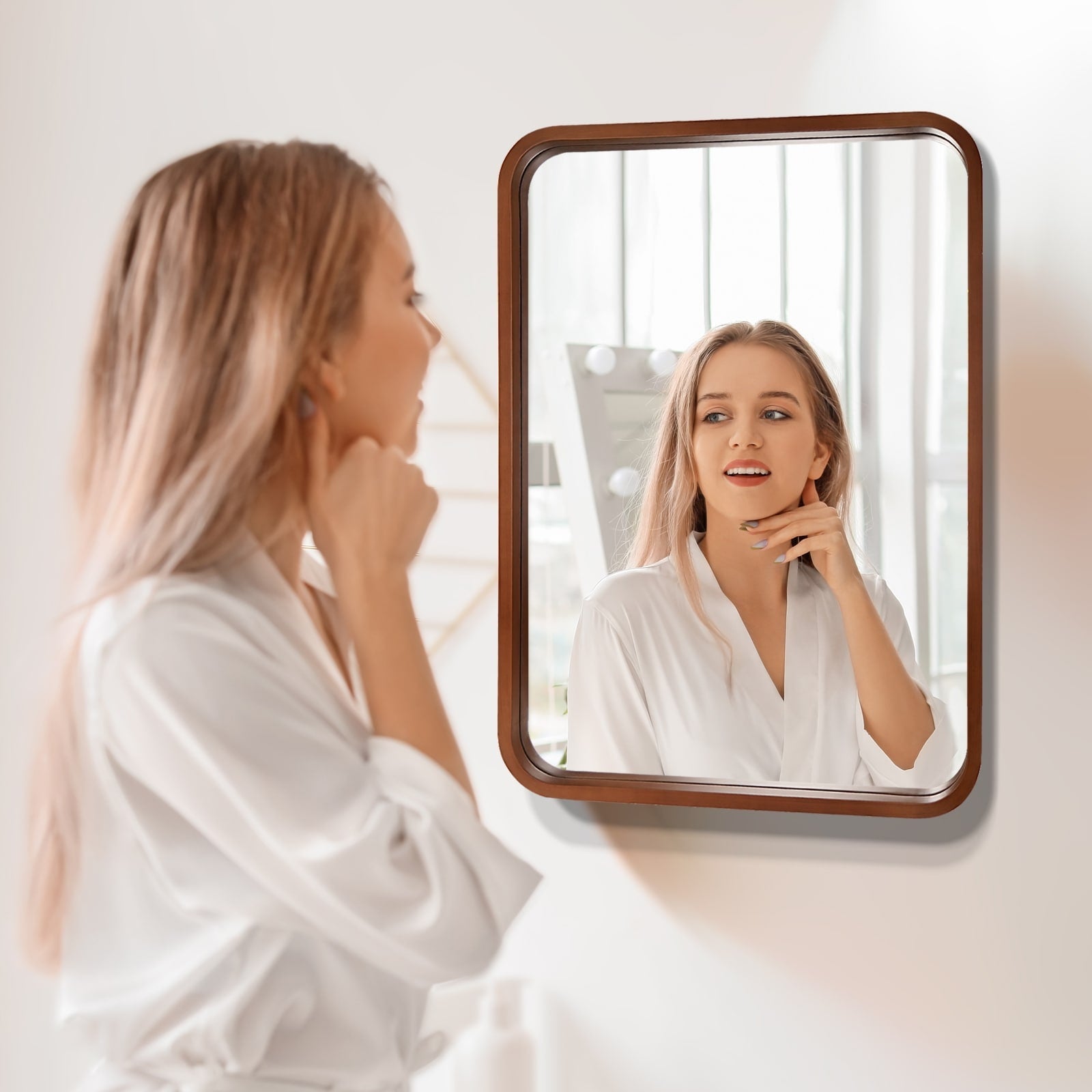 Round Corner Rectangle Farm Wall Mirror with Solid Wood Frame